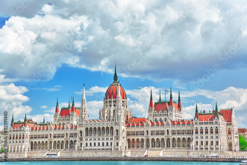 Fototapeta premium Hungarian Parliament at daytime. Budapest. View from Danube rive