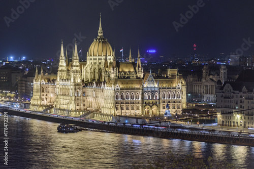 Obraz premium Hungarian Parliament Building at Night with Danube River Reflections
