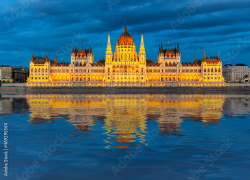 Fototapeta premium Hungarian Parliament building at sunset with reflection in Danube river,...