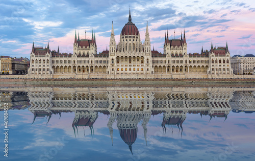© Mistervlad, Naklejka premium Hungarian Parliament building at sunset with reflection in Danube river, Budapest, Hungary