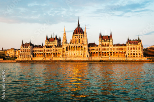 Fototapeta premium Hungarian Parliament on river at sunset, Budapest. Construction started building in 1885 and completed in 1904.