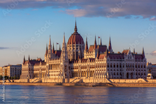 © ArturSniezhyn, Fototapeta premium Hungary, evening twilight in Budapest, parliament on the background of night city lights, cityscape