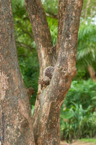 Obraz premium hungry fluffy grey squirrel climbing down the tree trunk