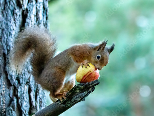 © Sarah, Fototapeta premium hungry little scottish red squirrel eating an apple on the branch of a tree
