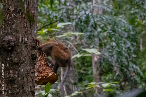 Fototapeta premium Hungry macaque monkey eating lunch high in the jungle tree
