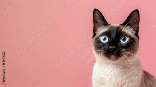 © The 2R Artificiality, Fototapeta premium Hungry Siamese cat with seal point markings gazing at camera with space for text on pink backdrop