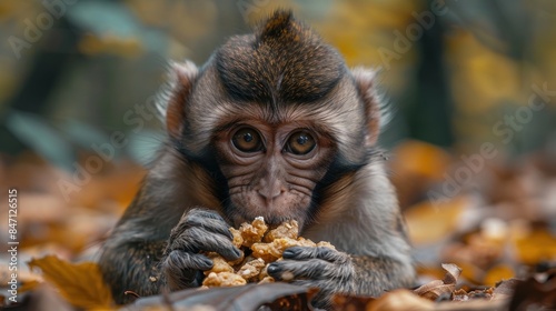 © piumi, Fototapeta premium Hungry thin dirty monkey in a garbage dump eating food waste, photo realistic