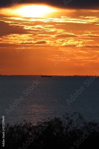 © Wendy, Fototapeta premium Hunstanton beach sun set over the sea ,glowing deep orange ball of fire