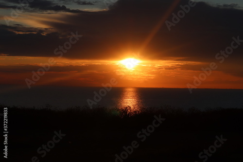 Fototapeta premium Hunstanton beach sun set over the sea ,glowing deep orange ball of fire