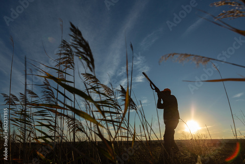 © Budjak Studio, Fototapeta premium Hunter aiming with rifle while standing against sky