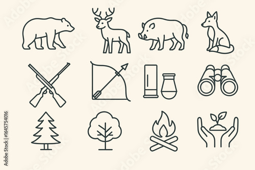 Fototapeta premium Hunting and Wildlife Icons Set – Forest Animals, Survival and Outdoor Elements