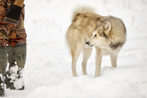 Naklejka premium hunting laika in winter forest wolf dog
