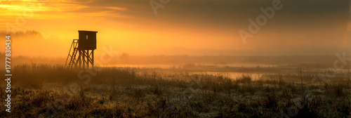 © Taras Vykhopen, Obraz premium Hunting stand overlooks foggy field at golden dawn in serene landscape