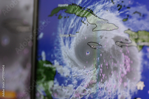 © Rokas, Fototapeta premium Hurricane Melissa shown on screen through windy app. Catastrophic storm towards Jamaica