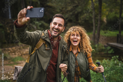 © Miljan Živković, Fototapeta premium husband and wife hiker take a self portrait or video call on hiking