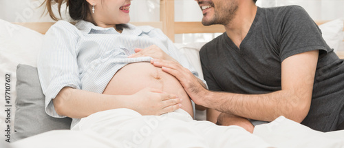 © eggeeggjiew, Fototapeta premium husband touching on her belly.