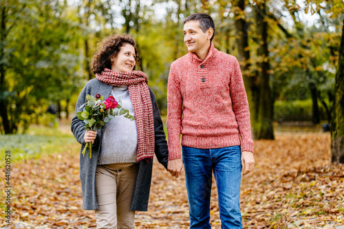 © Iryna, Fototapeta premium Husband with his pregnant wife holding by hands while walking in autumn park.