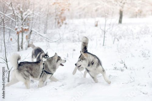 © Tortuga, Naklejka premium Huskies in snow wood.