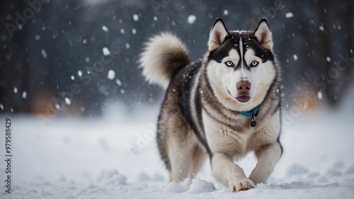 Naklejka premium Huskies pulling sled across snowy winter landscape