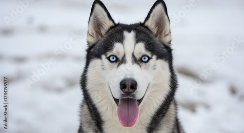 © Martin, Naklejka premium Husky adorable yeux bleus regard intense neige fond flou. AI Generated