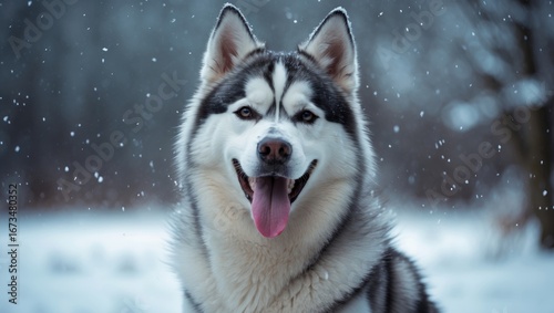 Naklejka premium Husky dog in winter snow with snowflakes falling, outdoor setting. Animal and...