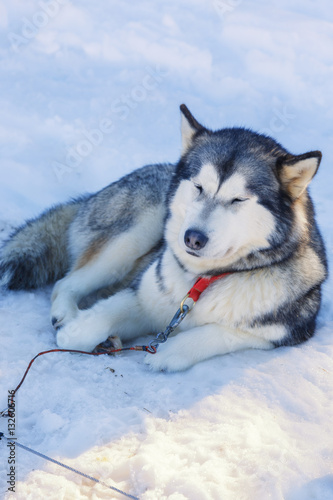 Fototapeta premium husky dog lying on snow. waiting for the dog owner