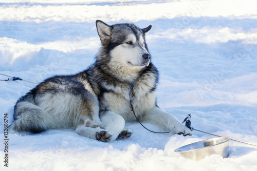 Fototapeta premium husky dog lying on snow. waiting for the dog owner