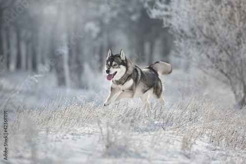 © kwadrat70, Naklejka premium Husky dog run free in winter snow forest