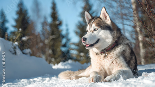 Naklejka premium Husky Dog Sitting in Snow