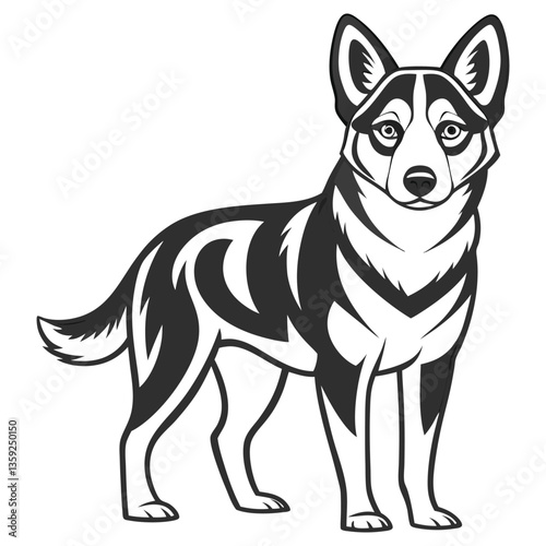 Naklejka premium Husky Dog Stand Pose, Black And White Line Art Style, Pet Animal Design