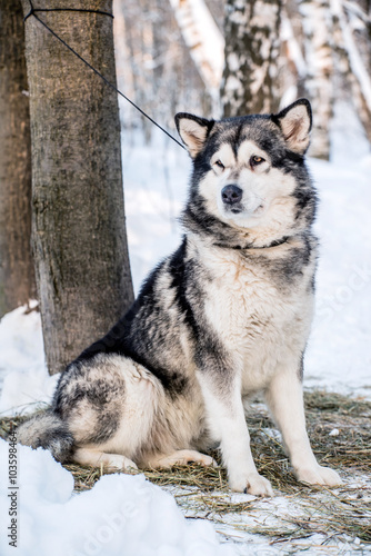 © Maksim Shebeko, Naklejka premium Husky in winter