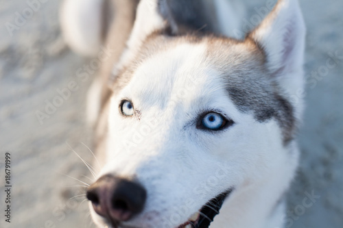 © Fifth of June, Obraz premium Husky laying on the beach