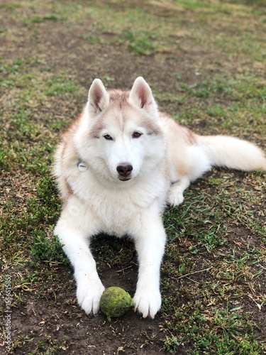 Obraz premium Husky plays with a ball Outdoor portrait close-up