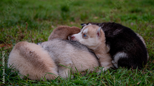 © YUABOG, Fototapeta premium Husky puppies sleep on the grass.