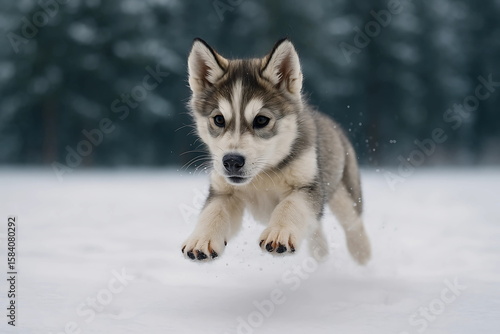 © SnapGPT, Naklejka premium Husky Puppy Mid-Air Zoomies in Fresh Snow