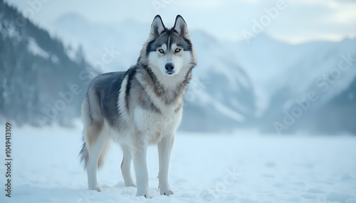 Fototapeta premium Husky standing in snowy mountains, cold and majestic winter landscape
