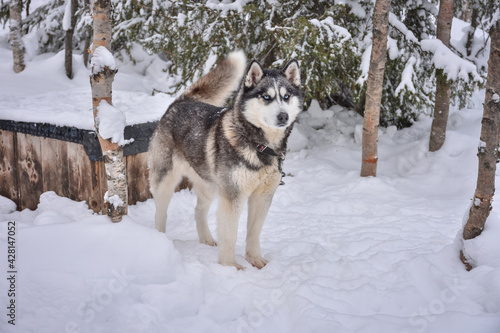 © Олег Спиридонов, Fototapeta premium Husky stands at the booth with a chain in a snowy forest
