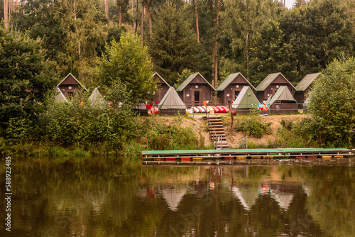 Fototapeta premium Huts at a camping place near Luznice river, Czech Republic