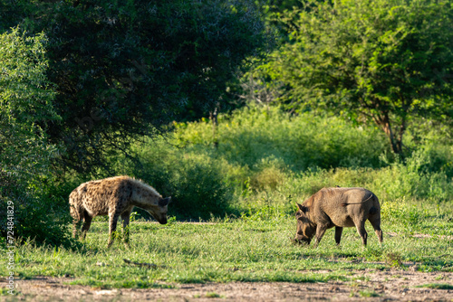 Fototapeta premium Hyène tachetée, Crocuta crocuta, Phacochère commun, Phacochoerus africanus,...