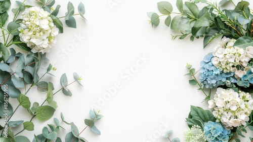 © The 2R Artificiality, Naklejka premium Hydrangea flower arrangement with eucalyptus on white background Top view mockup with text space