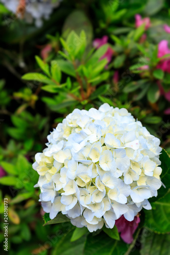 Obraz premium Hydrangea flower green leaf in nature park close-up with sunlight for...