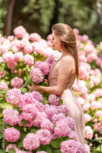 Fototapeta premium Hydrangeas Happy woman in pink dress amid hydrangeas. Large pink hydrangea...