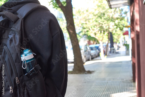 Obraz premium Hydration On-the-Go: Recyclable Bottle for Backpack Carrying
