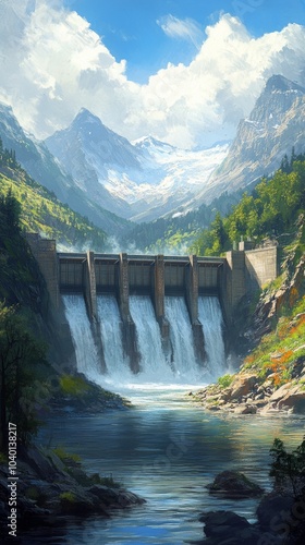 Fototapeta premium Hydroelectric Dam Impact Research, Evaluating ecological changes alongside sustainable energy generation in a river ecosystem.