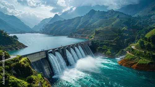 © Оля Ангельчева, Fototapeta premium hydroelectric power plant in mountain autumns