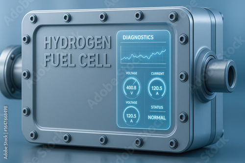 © Chopang.studio, Obraz premium Hydrogen fuel cell with digital diagnostics display showing voltage, current, and status, designed for clean energy applications and efficient power generation