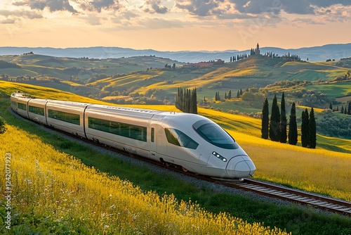 © Anusa, Fototapeta premium Hydrogen Powered Train Gliding Through Scenic Countryside Landscape