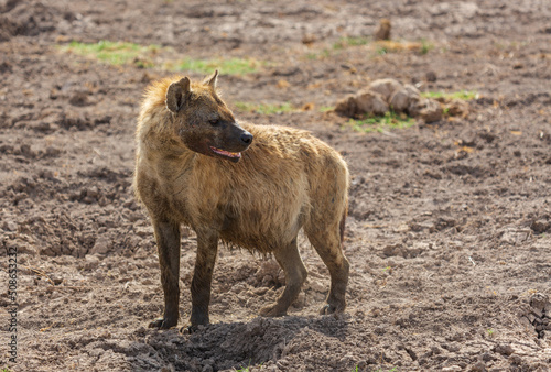 © Анастасия Смирнова, Fototapeta premium Hyena standing and watching in savannah. Amboseli national park. Kenya
