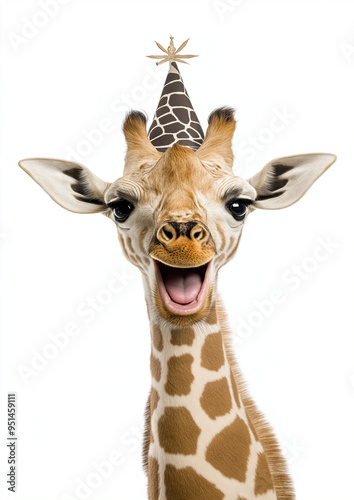 © KristinArt, Fototapeta premium Hyped Giraffe with Open Mouth Showing Surprised Excitement, Greeting Card Concept