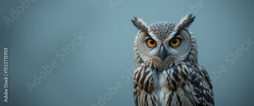 © Chookeit, Fototapeta premium Hyper-detailed fantasy owl with glowing orange eyes and sharp feathers standing against soft blue background, digital bird portrait in dramatic light